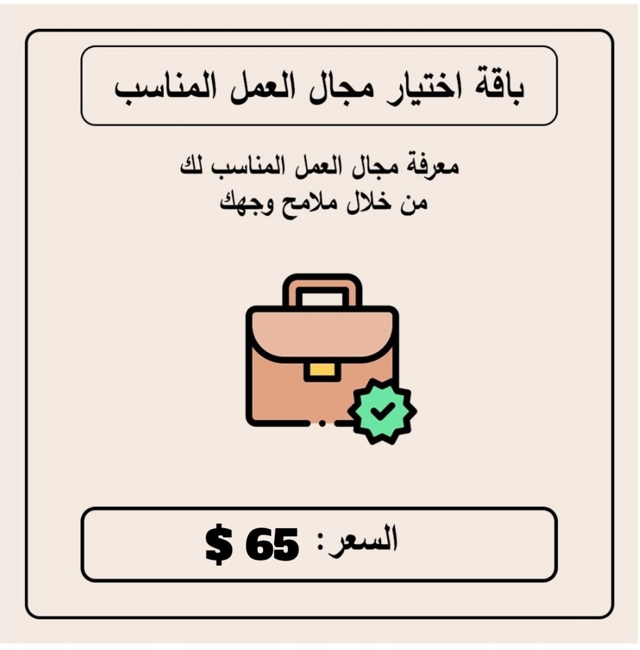 باقة اختيار مجال العمل المناسب تحليل فيديو مدته 30 دقيقة يكشف نقاط قوتك وأبرز 3 مجالات عمل تضمن لك النجاح المالي. تطوير مهارات القيادة، التفاوض، والبيع لرفع كفاءتك المهنية وتحقيق أعلى مستويات الرضا الوظيفي. خارطة طريق متكاملة تُسلم خلال 72 ساعة لتعزيز وعيك الذاتي وبناء مسيرة عملية أكثر إنتاجية.